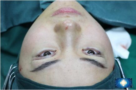 1、术前设计:于双侧上睑缘上方约7mm处设计重睑线,于双下睑睑缘下方设计横向切口线。