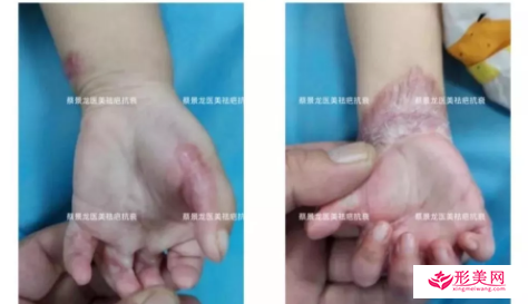 女,1岁2个月,来自四川。两个多月前患儿双手、右大腿不慎被沸水烫伤,在当地医院治疗半个月后一直用中药治疗,创面愈合后形成瘢痕,明显高出皮面,双手指严重屈曲畸形,不能够伸开,见下图。